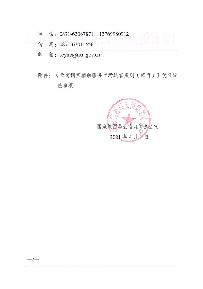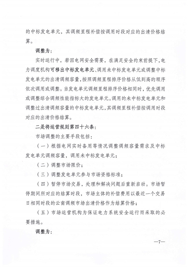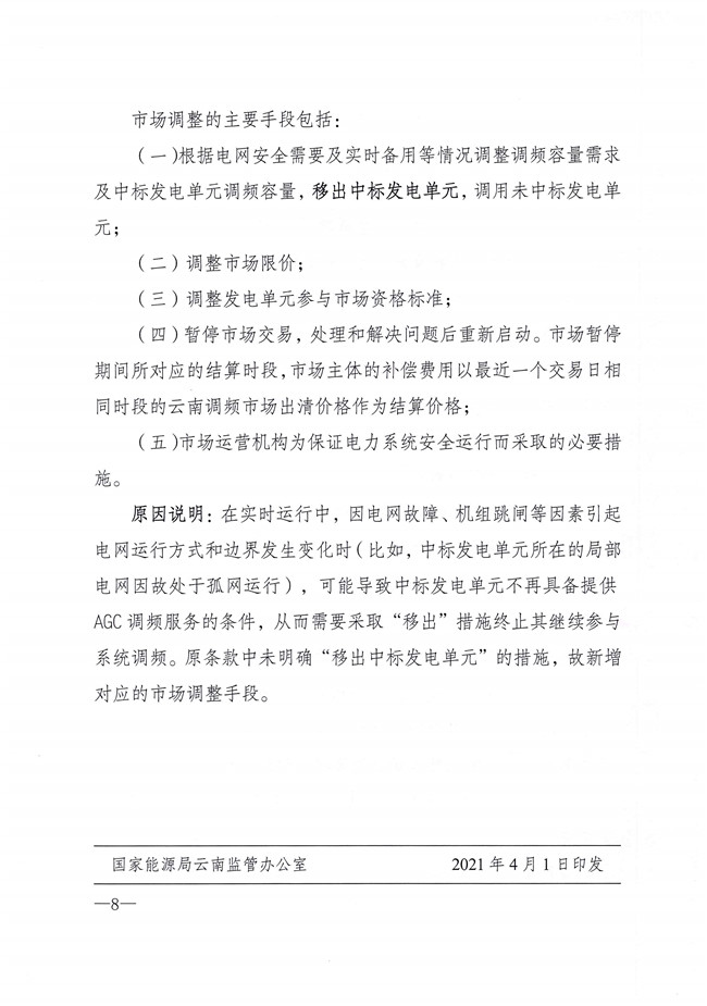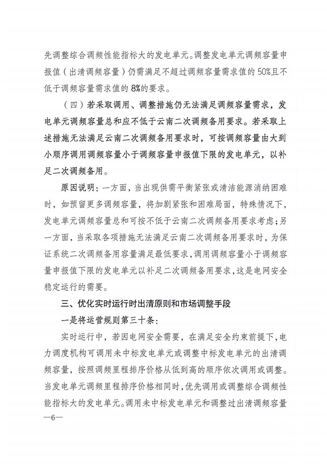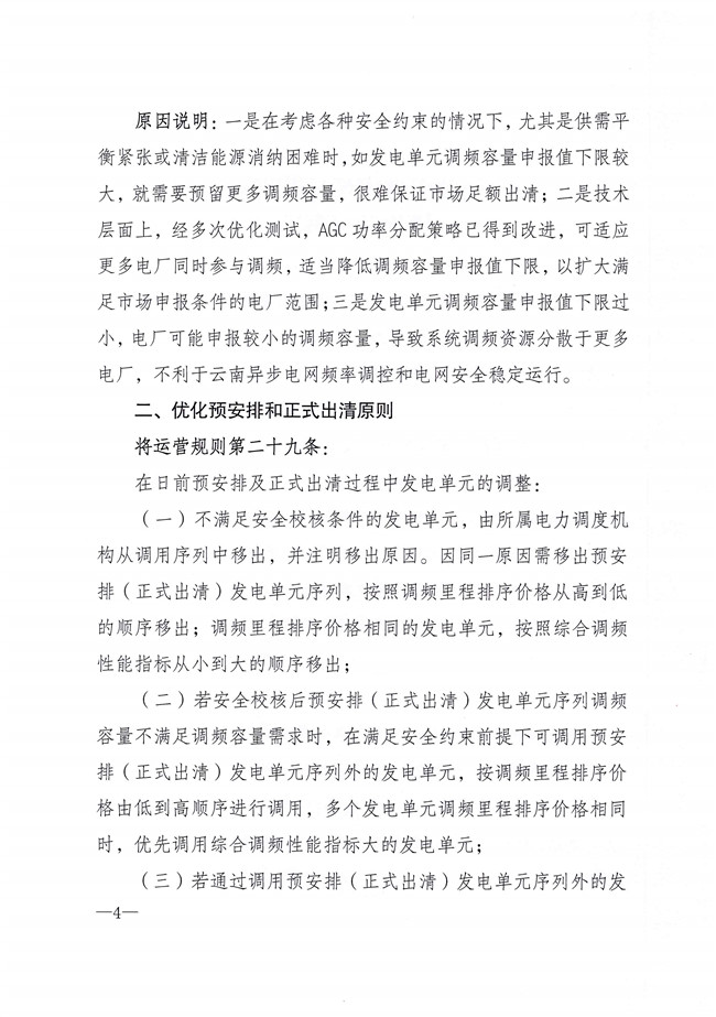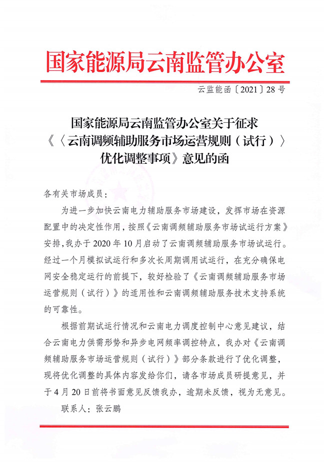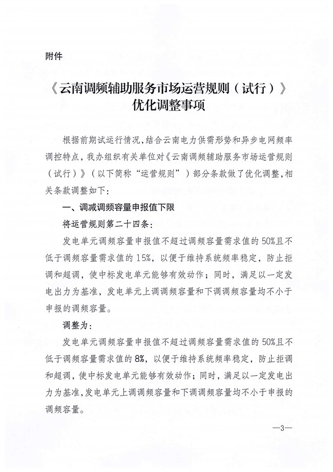 國家能源局云南監(jiān)管辦公室發(fā)布關(guān)于征求《〈云南調(diào)頻輔助服務(wù)市場運(yùn)營規(guī)則(試行)〉優(yōu)化調(diào)整事項(xiàng)》意見的函。對部分條款做了優(yōu)化調(diào)整,現(xiàn)面向市場成員研提意見,并于4月20日前將書面意見反饋。文件中提出將發(fā)電單元調(diào)頻容量申報(bào)值不超過調(diào)頻容量需求值的50%且不低于調(diào)頻容量需求值的15%,調(diào)整為發(fā)電單元調(diào)頻容量申報(bào)值不超過調(diào)頻容量需求值的50%且不低于調(diào)頻容量需求值的8%。詳情如下: